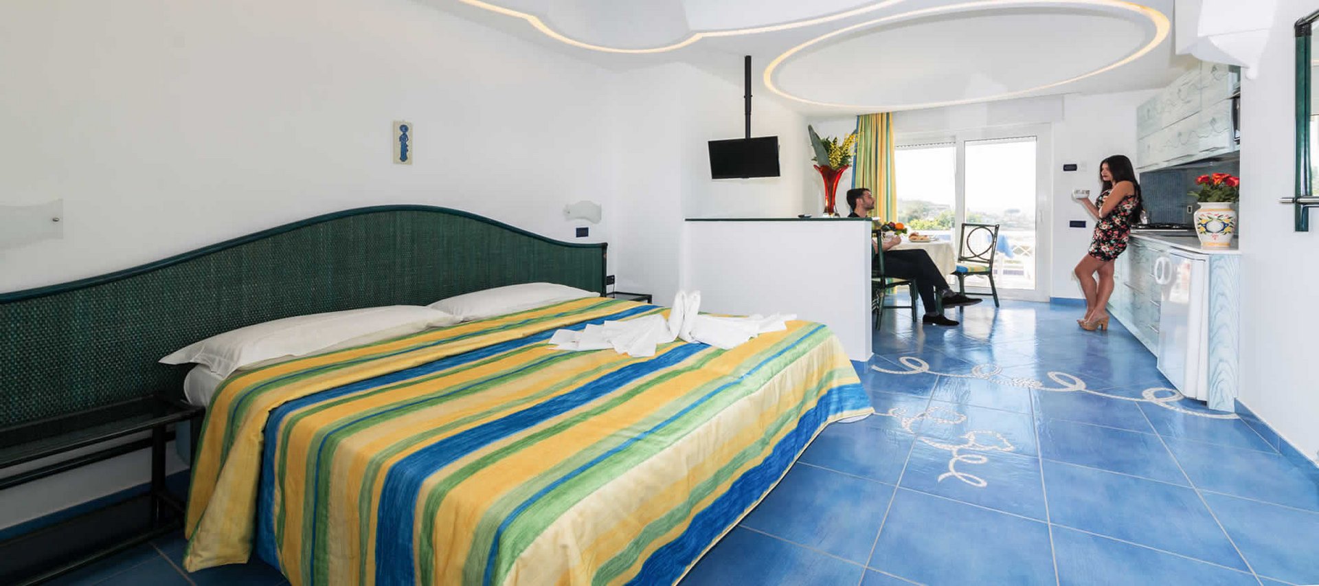 Zimmer: Die (40) Zimmer sind freundlich und geschmackvoll eingerichtet und verfügen alle über Fernseher, Telefon mit Direktanschluss, Föhn, Heizung. Alle Zimmer verfügen über einen romantischen Blick auf Forio und das Meer, mit Balkon oder Terrasse ausgestattet. Gegen Gebühr Safe und Klimaanlage.