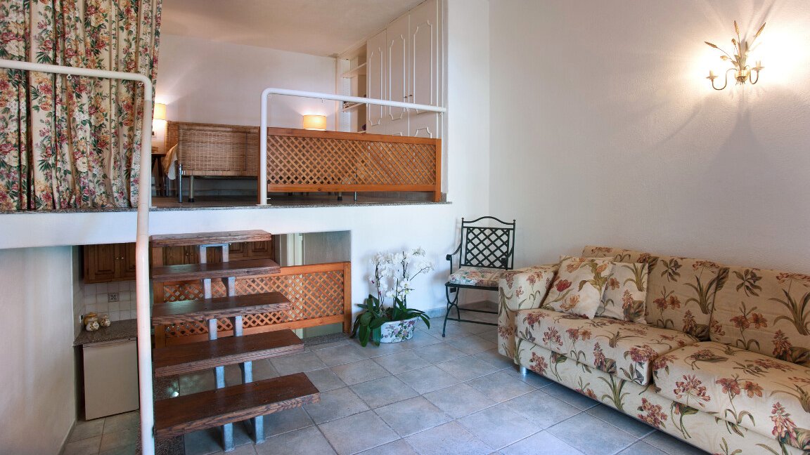 Mono A: Einzimmer-Apartment für 2-3 Personen auf 3 Etagen mit Wohnzimmer mit Schlafcouch und Kochecke, Schlafzimmer auf einer offenen Zwischendecke, Badezimmer.