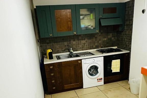 Die Küchenzeile ermöglicht die Zubereitung von Frühstück bis Abendessen. Neben einem Ofen und eines Kühlschranks ist auch eine Waschmaschine vorhanden.