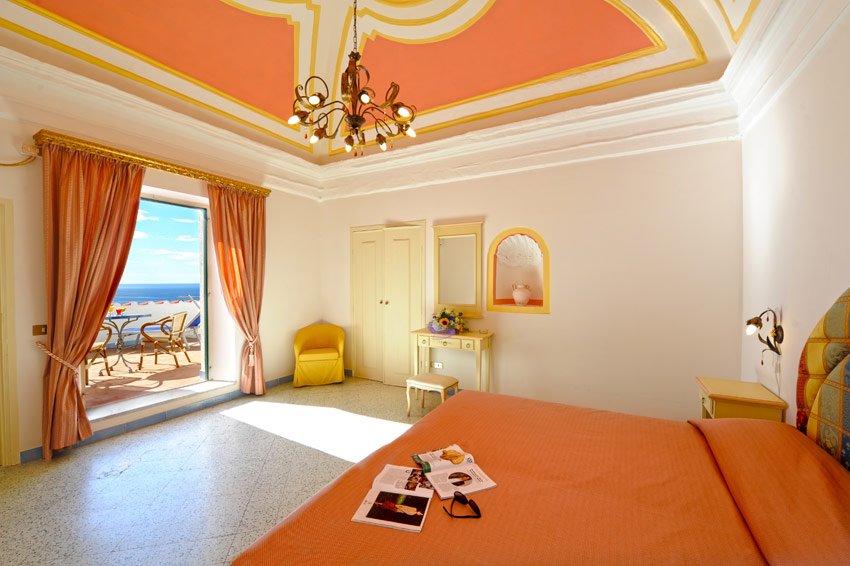 Zimmer: Die (22) hell und großzügigen Zimmer sind aufgeteilt in 7 Superior und 15 Standard Zimmer. Alle verfügen über Dusche/WC, Föhn, Sat-TV, Telefon, Minibar, Klimaanlage und Wifi-Anschluss. Die geräumigen Superior Zimmer, ausgestattet mit Fresken und Statuen aus 800, liegen im Haupthaus und verfügen über eine große private Terrasse mit Blick auf das tiefblaue Meer und den Sarazenenturm. Die Standard Zimmer liegen außerhalb des Haupthauses im Garten verteilt mit eigener Terrasse und Meerblick.