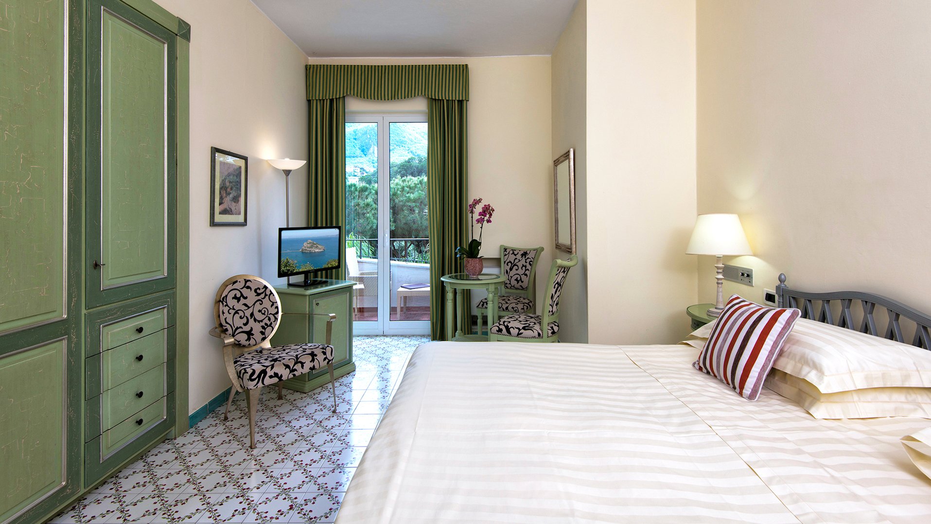Ausstattung: Das elegante und gepflegte Haus besteht aus einem Haupthaus und einem Nebengebäude und verfügt über eine stilvoll eingerichtete Lobby mit Rezeption (Lift), freundlich eingerichtete Sitzecken und Aufenthaltsräume, Fernseh-Raum, klimatisiertes Restaurant und Bar. In der Sommermonaten lädt das Gartenrestaurant „Epomeo“ zu gemütlichen Stunden ein. Im wunderschönen, weitläufigen Garten mit exotischen und mediterranen Pflanzen stehen den Hotelgästen Liegen und Sonnenschirme zur Verfügung. Kostenloser Parkplatz nach Verfügbarkeit.