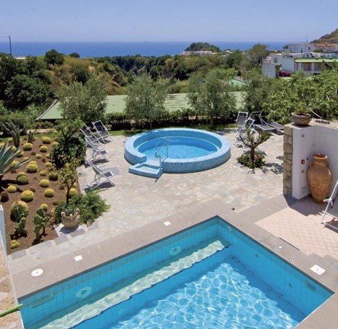Lage: Freundlich geführtes Hotel in ruhiger Lage auf dem Weg zur Bucht von Sorgeto, bekannt wegen der natürlichen heißen Thermalquelle. Die Anlage ist wie eine typische süditalienische Villa gebaut mit Bögen, weißen Mauern und großzügigen Räumlichkeiten und ist umgeben von einem zauberhaften und gepflegten Garten mit exotischen Pflanzen, Olivenbäumen, duftenden Zitronenbäumen, roten und pinkfarbene Bougainville-Pflanzen und Weinlauben.