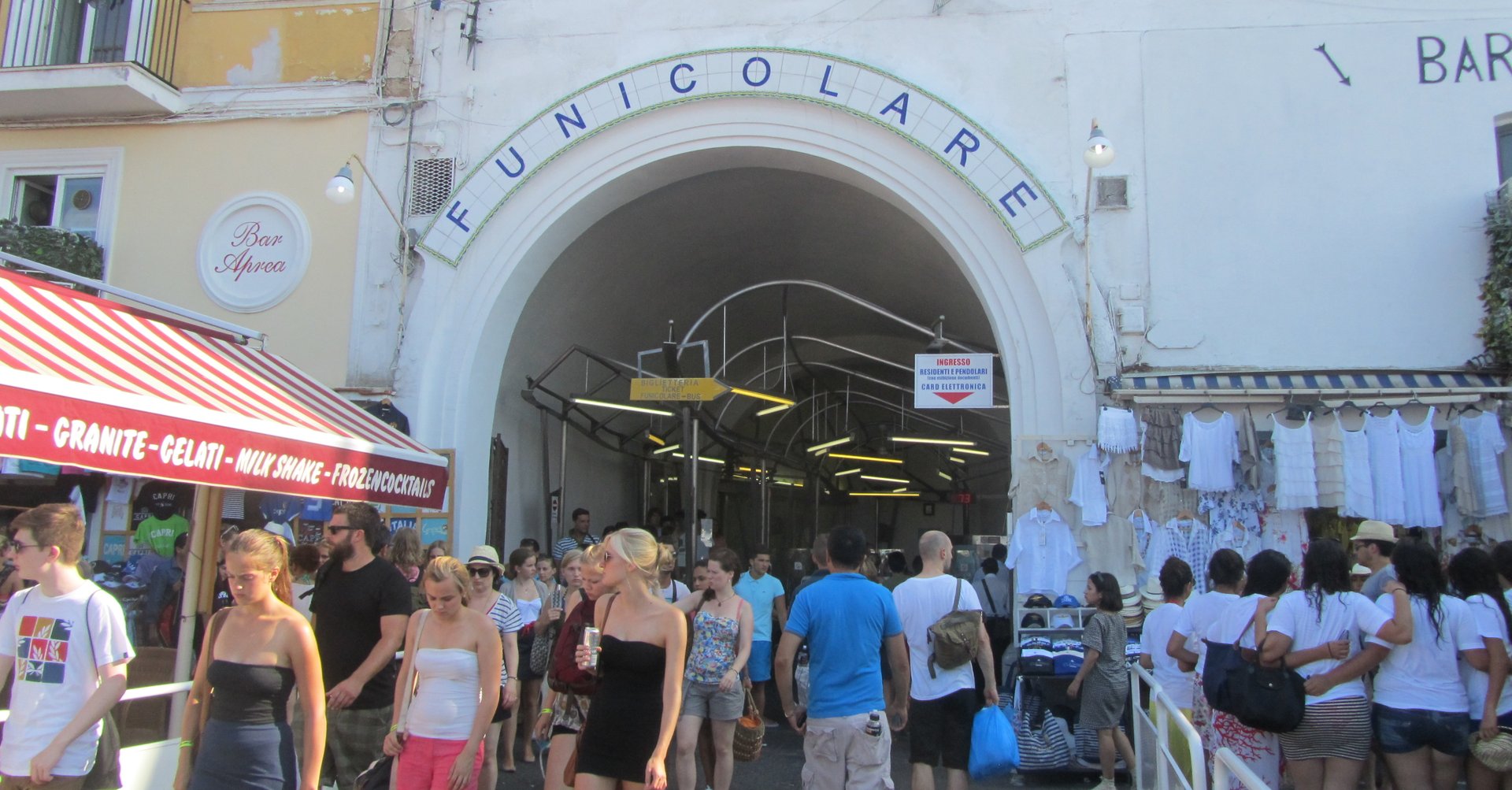 Am Hafen Marina Grande herrscht ein ständiges kommen und gehen. Am Ende der jetzigen Mole ist die Touristen Information, rechts der Busbahnhof für die Linienbusse nach Capri und Anacapri sowie der Standplatz der Taxen. Gleich dahinter der öffentliche Strand von Marina Grande. Links von der Mole auf der Piazza Vittoria befindet sich die berühmte Seilbahn, welche in wenigen Minuten direkt hinauf zu der Piazzetta Umberto I fährt.