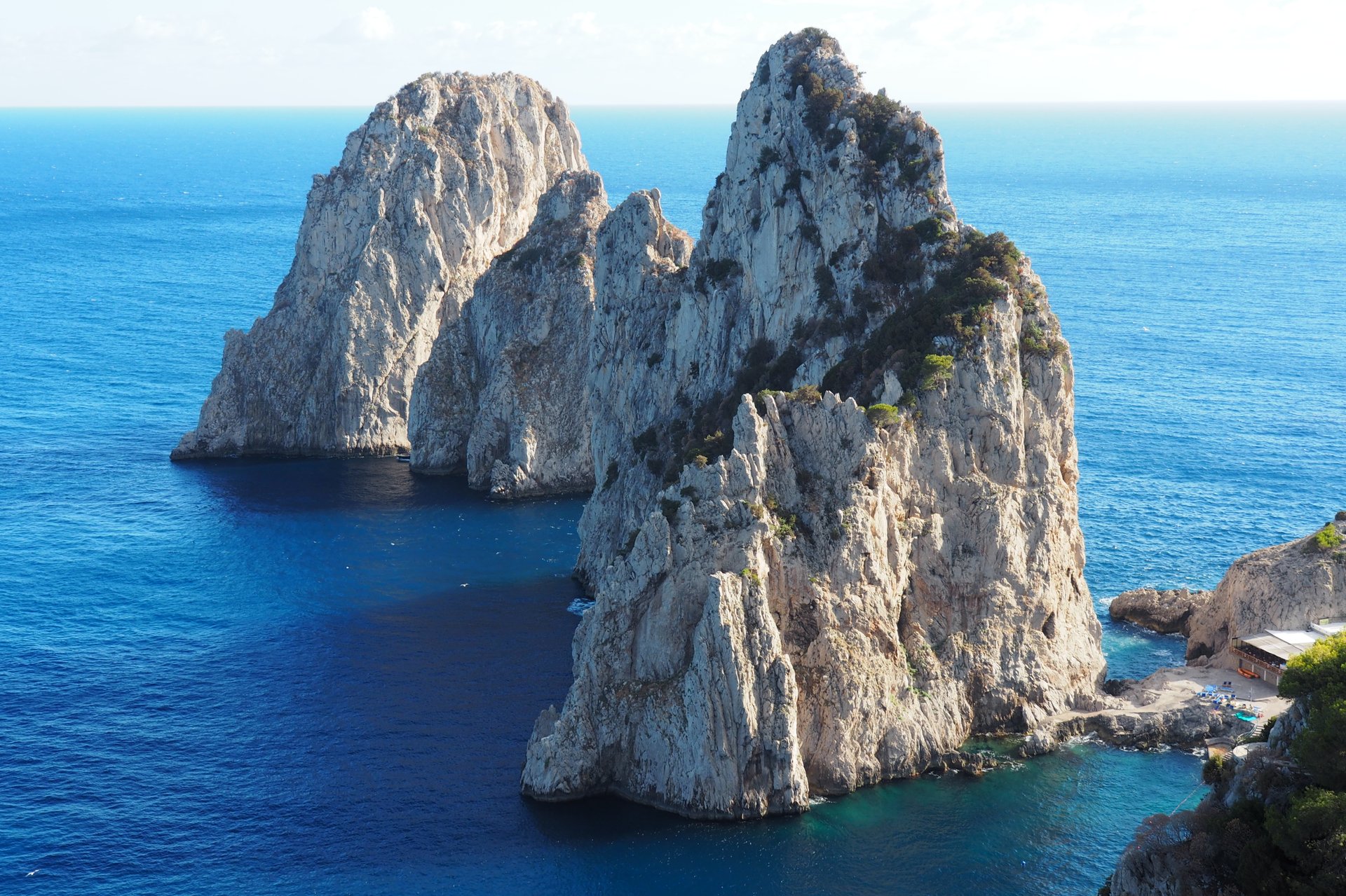 Rundum die Insel befinden sich atemberaubenden Grotten mit einzigartigen Farben und Lichtverhältnissen, Felsformationen mit prächtiger Mittelmeer Macchia, der gewaltige Naturbogen Arco Naturale und nicht zu vergessen die weltbekannten Faraglioni-Felsen, das Wahrzeichen der Insel Capri.