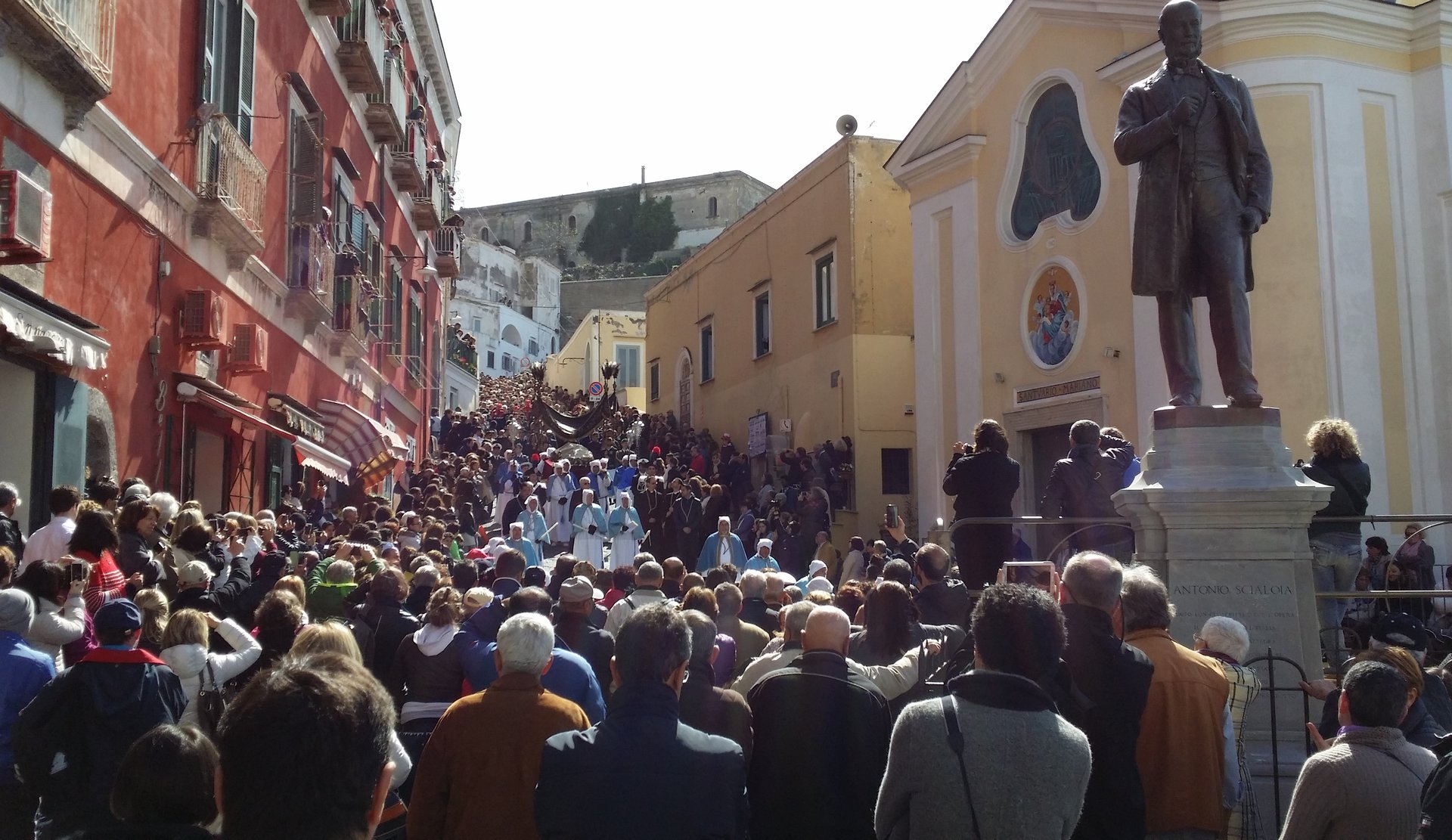 Von Haupthafen erreicht man zu Fuß oder mit einem Microtaxi durch enge Gassen die Piazza dei Martiri und die sehenswerte Kirche S. Maria delle Grazie. Ein paar Meter weiter oberhalb befindet der Belvedere dei Cannoni, ein Aussichtpunkt mit tollen Blicken auf die Insel Ischia und auf den pittoresken Fischerhafen Corricella.