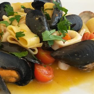 leckere Spaghetti mit Venusmuscheln und Tomaten auf Ischia