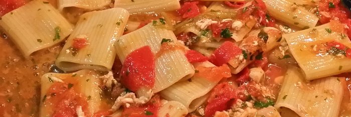Zutaten: Olivenöl, Knoblauch, Tomaten, Salz, Pfeffer, Petersilie, Peperoncino (Scharf);